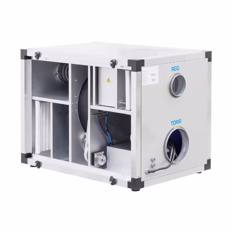 Hölje med ramverk och isolerade paneler av eloxerad aluminium samt ställbara maskinskor. Komplett med inbyggd elektronisk styrutrustning. EC-fläktar för process respektive regenereringsluft. Regenereringsvärmare av PTC element utan överhettningsrisk. Svensktillverkad patenterad sorptionsrotor. Kompakta mått och extremt låg vikt. Levereras med 2,5m strömkabel och stickkontakt.