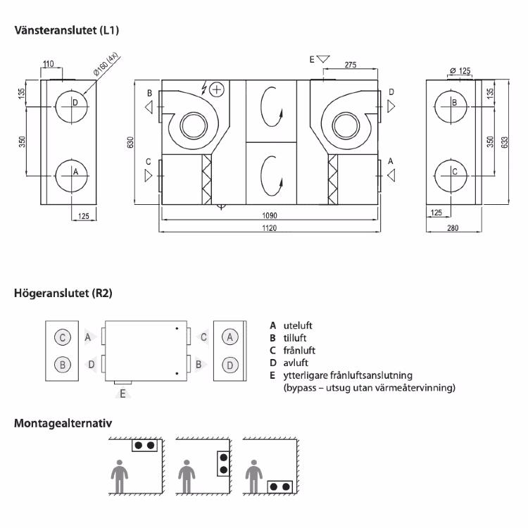 - Maximalt luftflöde 288 m3/h