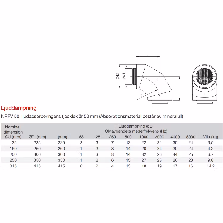 Böjd ljuddämpare NRFV50, 160 1 620 kr Teknisk dataVarumärke: ETSNominell kanaldiameter: 125 mmIsoleringstjocklek: 50 mmMaterial isolering: StenullVikt: 3.5 kgYtterdiameter: 225 mmMed skyddsduk: JaMa I lager Lägg i korgen Dela Information Recensioner Teknisk dataVarumärke: ETSNominell kanaldiameter: 125 mmIsoleringstjocklek: 50 mmMaterial isolering: StenullVikt: 3.5 kgYtterdiameter: 225 mmMed skyddsduk: JaMaterial ytterrör: Varmförzinkat stål